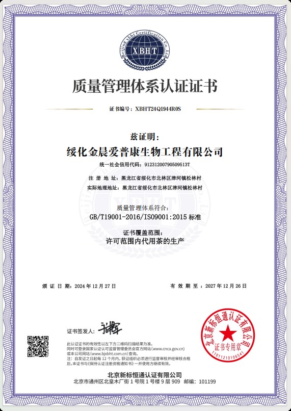 綏化金晨愛普康生物工程有限公司位于黑龍江省中南部地區(qū)的綏化市北林區(qū),所處位置東經(jīng)124度,北緯45度,位于松嫩平原的呼蘭河流域,“有寒地黑土,塞北江南”的美譽,是全國重要的商品糧基地,屬中溫帶大陸性季風(fēng)氣候,四季分明,雨熱同期,冬季冰雪覆蓋,夏季降雨集中氣候溫?zé)釢駶櫋=椈鸪繍燮湛瞪锕こ逃邢薰臼且患覍I(yè)從事健康養(yǎng)生產(chǎn)品研發(fā)、生產(chǎn)及銷售企業(yè),公司占地總面積8000平方米,建筑面積5000平方米,公司周圍無任何污染源,是食品生產(chǎn)基地。公司生產(chǎn)車間潔凈度級別達到10萬級,同時擁有數(shù)十臺先進的生產(chǎn)設(shè)備及高科技檢驗儀器,從產(chǎn)品的原輔料、中間品、成品到銷售的全過程嚴格把關(guān),使生產(chǎn)中每道工序都符合產(chǎn)品的高標(biāo)準(zhǔn)要求,從而保證了公司生產(chǎn)的每一袋產(chǎn)品合格,無質(zhì)量缺陷。綏化金晨愛普康生物工程有限公司率先采用了企業(yè)資源ERP管理系統(tǒng),肩負著養(yǎng)生產(chǎn)業(yè)的重要課題,同時又是江蘇省國家藥用植物重點實驗中心科研成果轉(zhuǎn)化的生產(chǎn)試驗基地,公司核心成員均為本科以上學(xué)歷。生產(chǎn)的產(chǎn)品有近五十個品種的代用茶產(chǎn)品,公司先后通過HALAL國際認證,編號為SSPY-201318-33849;ISO9001質(zhì)量管理體系認證編號為XBH···